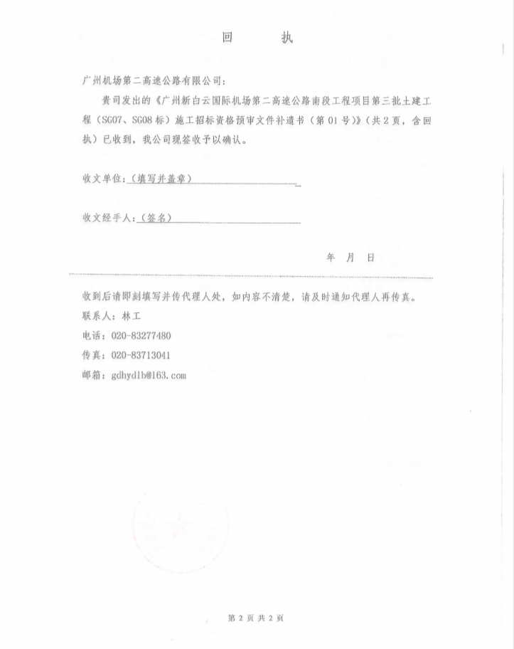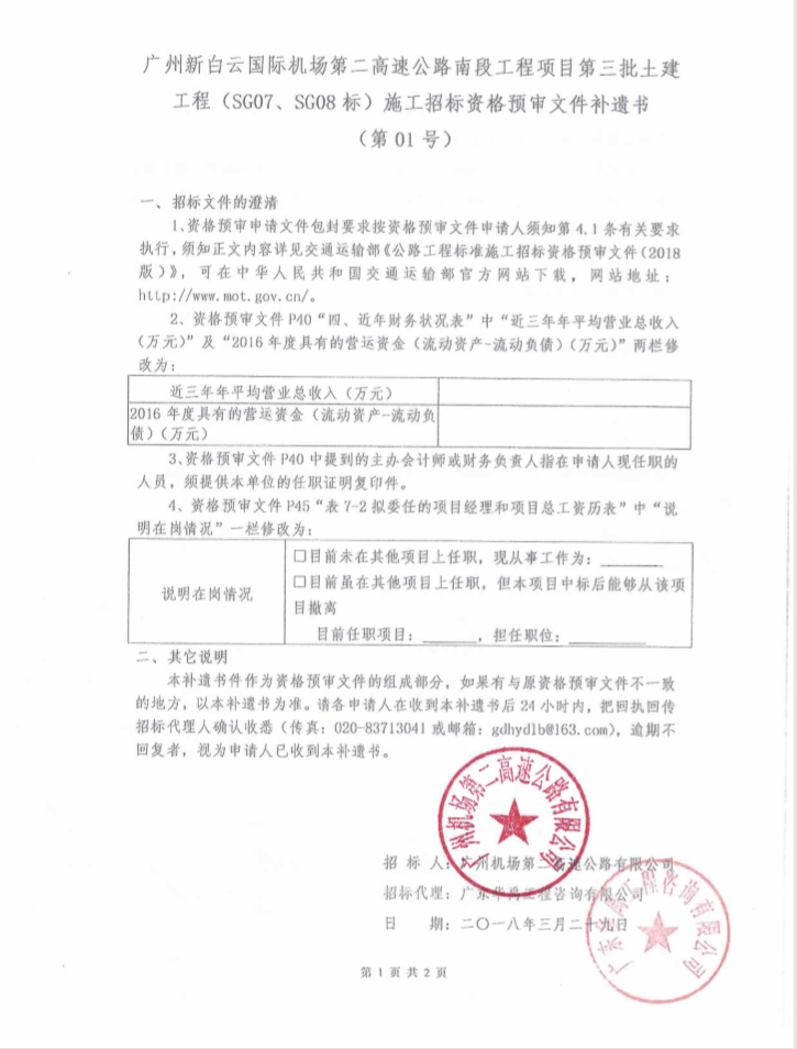 补遗书 - 广州新白云国际机场第二高速公路南段工程项目第三批土建工程(SG07、SG08标)施工招标资格预审文件补遗书(第01号)