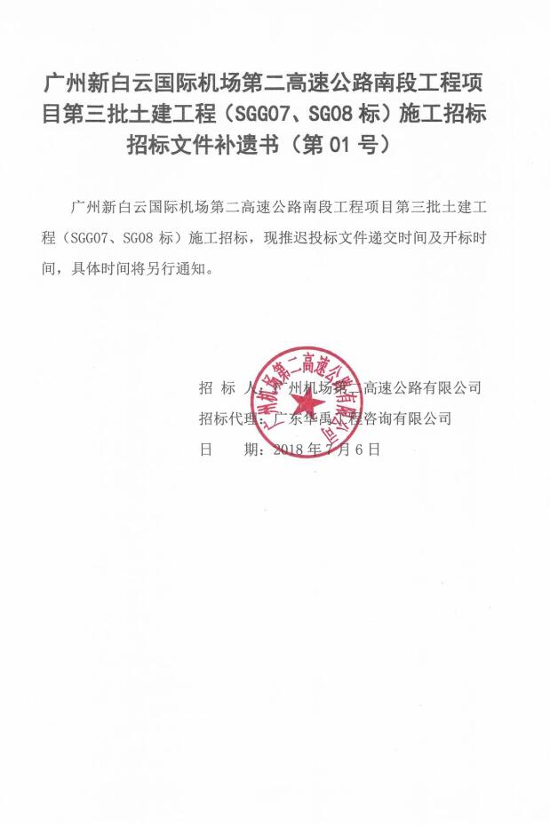 补遗书 - 广州新白云国际机场第二高速公路南段工程项目第三批土建工程(SGG07、SG08标)施工招标招标文件补遗书(第01号)
