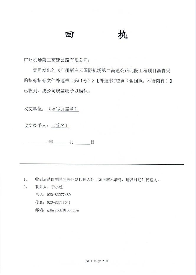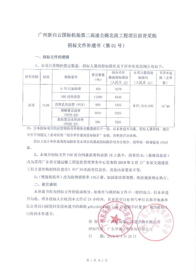 补遗书 - 广州新白云国际机场第二高速公路北段工程项目沥青材料采购招标文件补遗书(第01号)