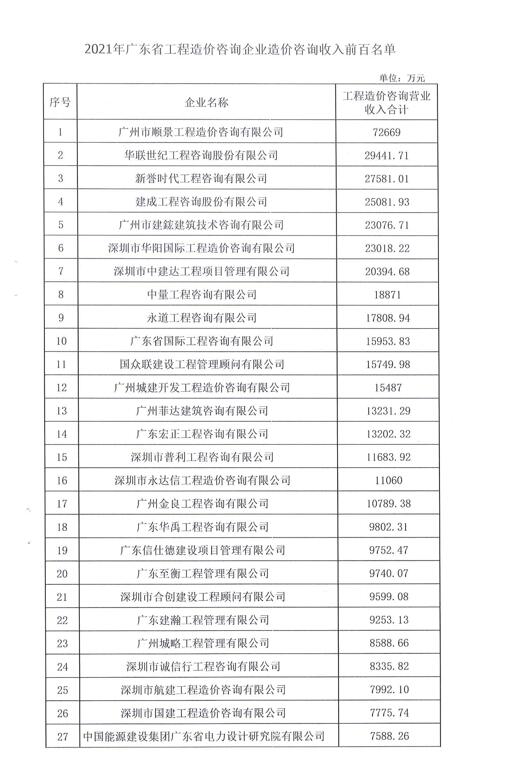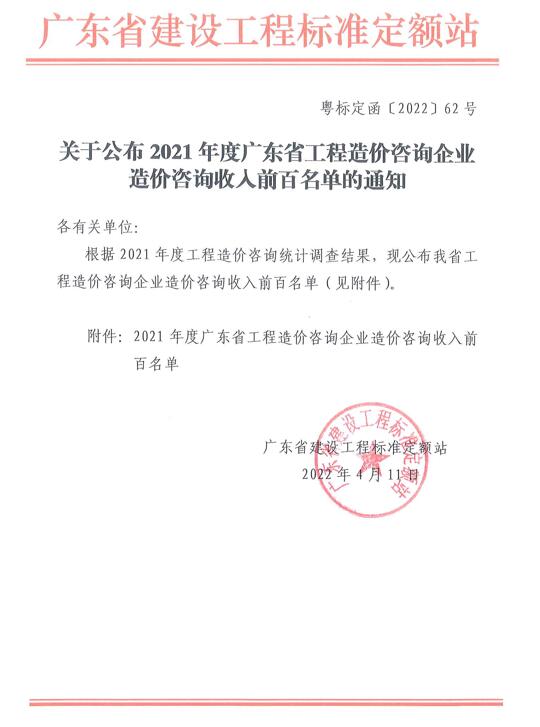 【转】关于公布2021年度广东省工程造价咨询企业造价咨询收入前百名单的通知(粤标定函〔2022]62号)